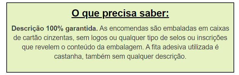 Descrição 100% garantida. As encomendas são embaladas em caixas de cartão cinzentas, sem logos ou qualquer tipo de selos ou inscrições que revelem o conteúdo da embalagem. A fita adesiva utilizada é castanha, também sem qualquer descrição.